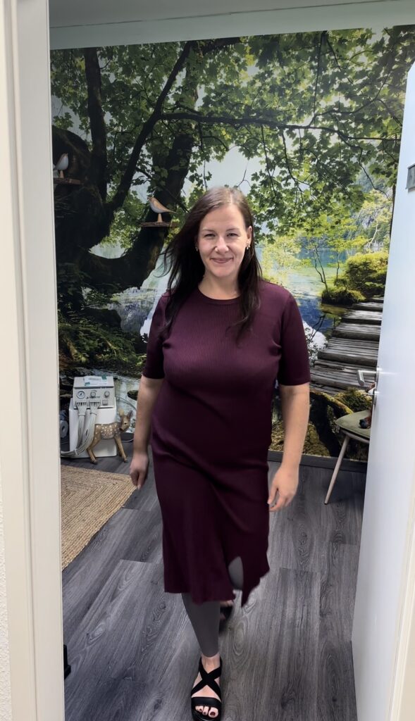 Der Look verbindet eine festliche Ausstrahlung mit hohem Tragekomfort und eignet sich ideal für einen langen Abend. Passend dazu trägt Jenny den mediven cozy von medi in der Farbe Grau mit dem Fashion Muster „Wild“. Das dezente Design lässt sich vielseitig kombinieren und setzt gleichzeitig einen modischen Akzent.